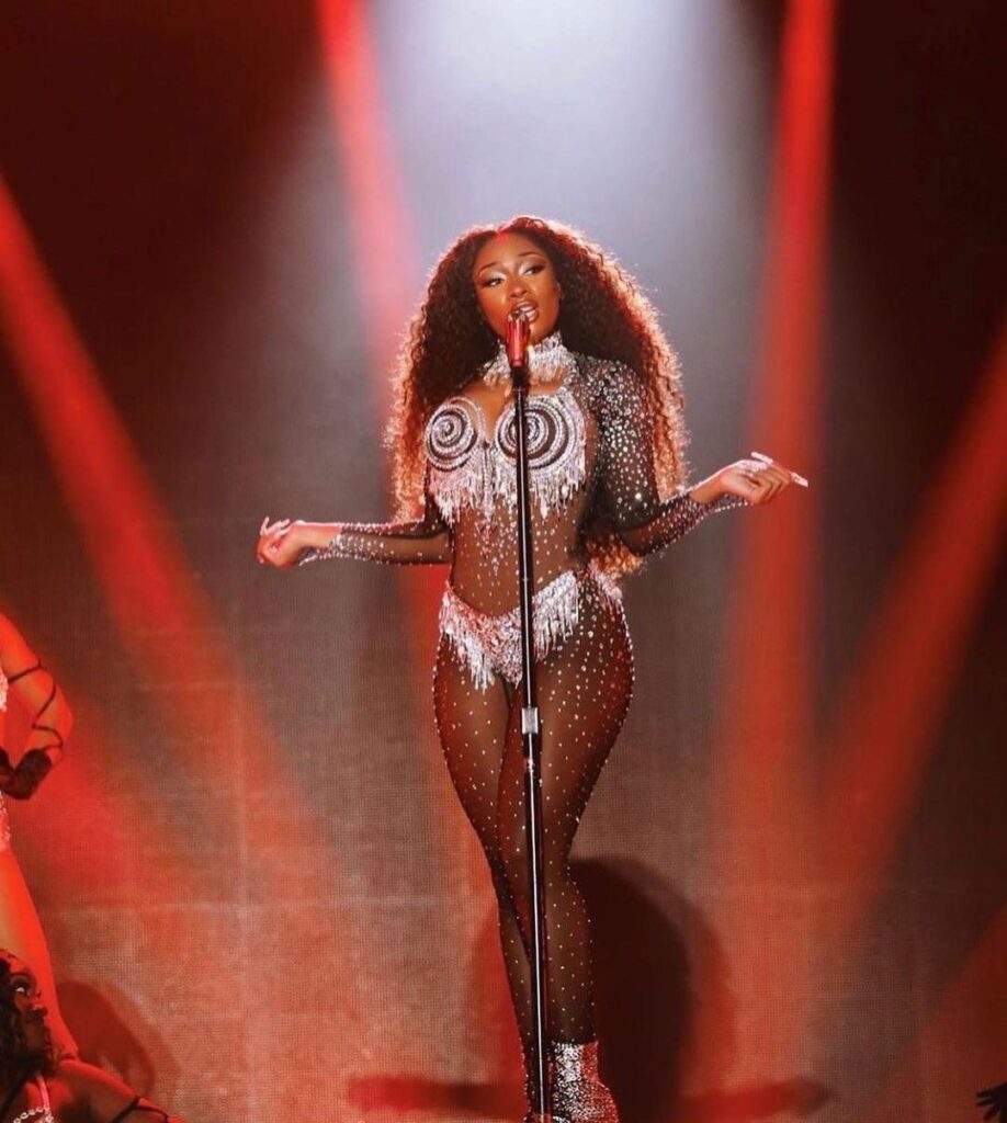 Megan Thee Stallion Performed at L.A. Pride in a Full Custom Diamond L.O.C.A Goddess Look Inspired by Grace Jones and Diana Ross